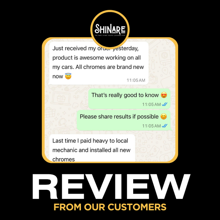 Achieve the ultimate shine with our Premium Chrome Shiner | Shinare. Our expert formula, designed by industry professionals, is scientifically proven to provide a flawless, long-lasting finish. Say goodbye to dull surfaces and hello to a polished, professional look.